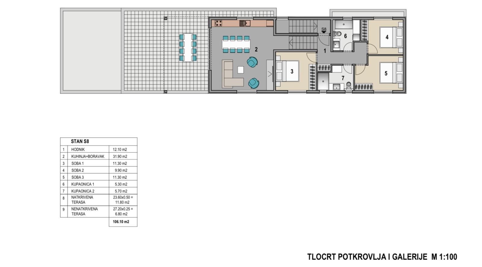 Pag - Mandre, predáva sa trojizbový apartmán o rozlohe 106,10 m2 v podkroví obytného objektu s celkovo ôsmimi apartmánmi, vo výstavbe, plánované nasťahovanie 07/2026. Kvalitná výstavba, podlahové kúrenie v každej izbe, elektrické rolety, keramické dlaždice v celom byte, atď... Skladá sa z: troch spální, obývacej izby + kuchyne + jedálne, chodby, dvoch kúpeľní a terasy. Z APARTMÁNU JE VÝHĽAD NA MORE!!! Nachádza sa na výbornej lokalite 420 m od mora a pláže, v blízkosti kaviarní, reštaurácií, obchodov a všetkých ostatných zariadení potrebných pre príjemnú dovolenku!!! Dispozične má parkovacie miesto a sklad. Dokumentácia je v poriadku. Pôdorys pozrite byt označený S8. For more information: Petra Vučković Tel: +385 91 6193806 Email: futuranekretnine@gmail.com ID NEKRETNINE: iro-699183