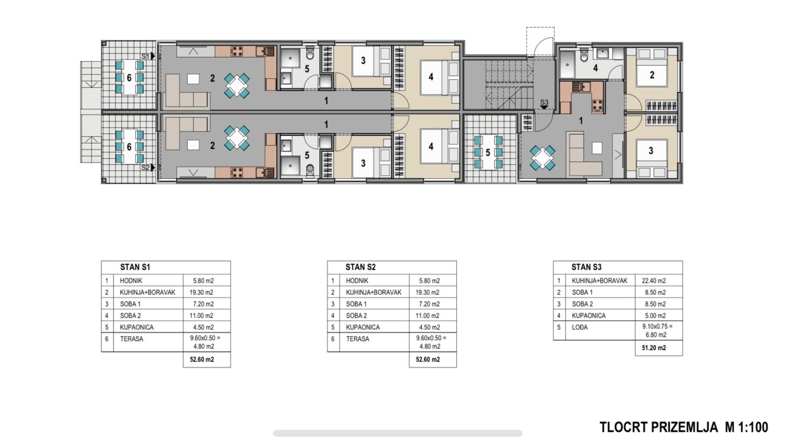 Pag - Mandre, predáva sa dvojizbový apartmán o rozlohe 52,60 m2 na prízemí obytného objektu s celkovo ôsmimi apartmánmi, vo výstavbe, plánované nasťahovanie 07/2026. Kvalitná výstavba, podlahové kúrenie v každej izbe, elektrické rolety, keramické dlaždice v celom byte, atď... Skladá sa z: dvoch spální, obývacej izby + kuchyne + jedálne, chodby, kúpeľne a terasy. Z APARTMÁNU JE VÝHĽAD NA MORE!!! Nachádza sa na výbornej lokalite 420 m od mora a pláže, v blízkosti kaviarní, reštaurácií, obchodov a všetkých ostatných zariadení potrebných na príjemnú dovolenku!!! Dispozične má parkovacie miesto, záhradu o rozlohe 125,46 m2, bazén a sklad. Dokumentácia je v poriadku. Pôdorys pozrite byt označený S2. For more information: Petra Vučković Tel: +385 91 6193806 Email: futuranekretnine@gmail.com ID NEKRETNINE: iro-699184